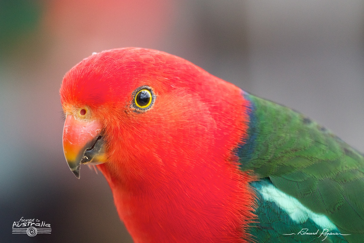 This Australian King Parrots couple (endemic species) was completely free but, because we were standing under the canopy to the Blue Mountains Scenic Railway (GPS location), the parrots eyes were reflecting the structure. I then decided to remove those “urban” reflexions by re-drawing an eye part. Now, this birds doesn't feel locked in, even if they were not, and even if they are sadly half tamed with seeds… for The Tourist to be happy…