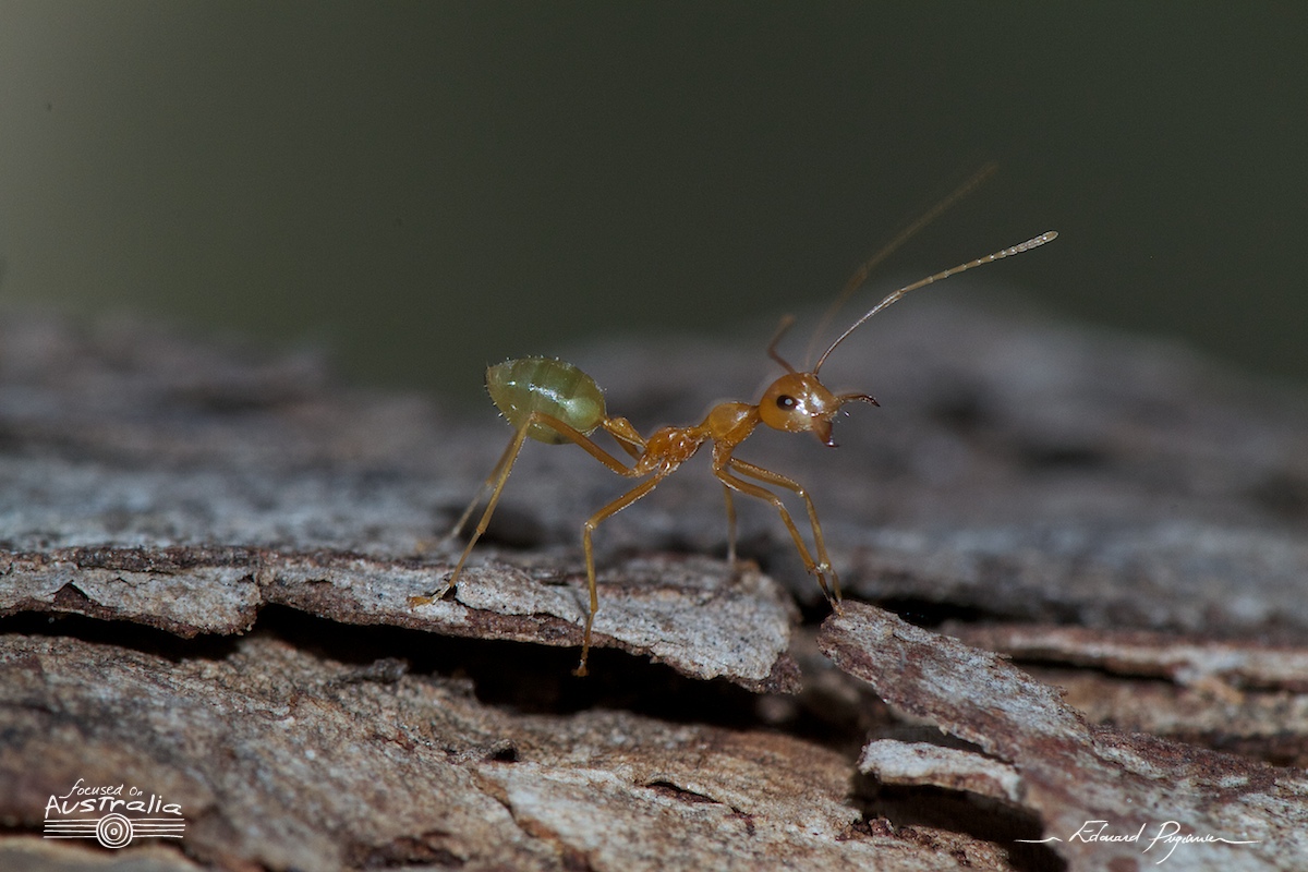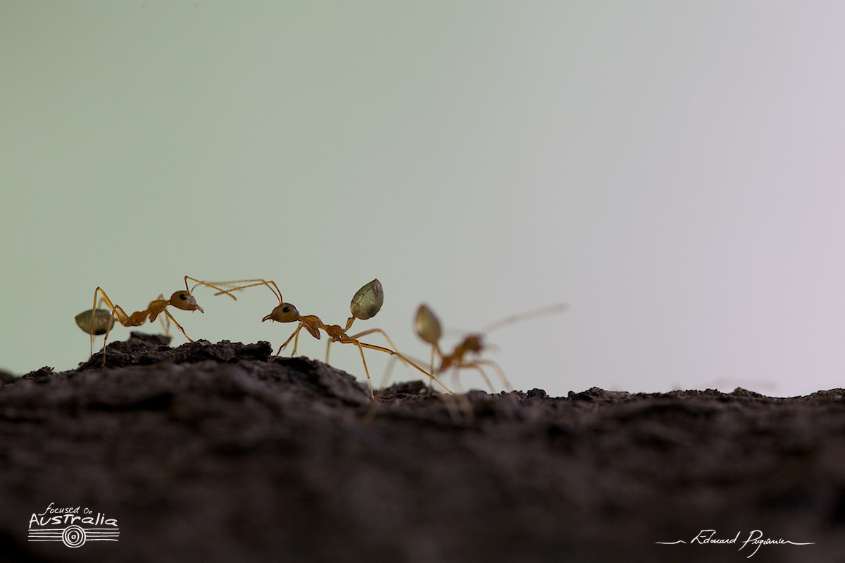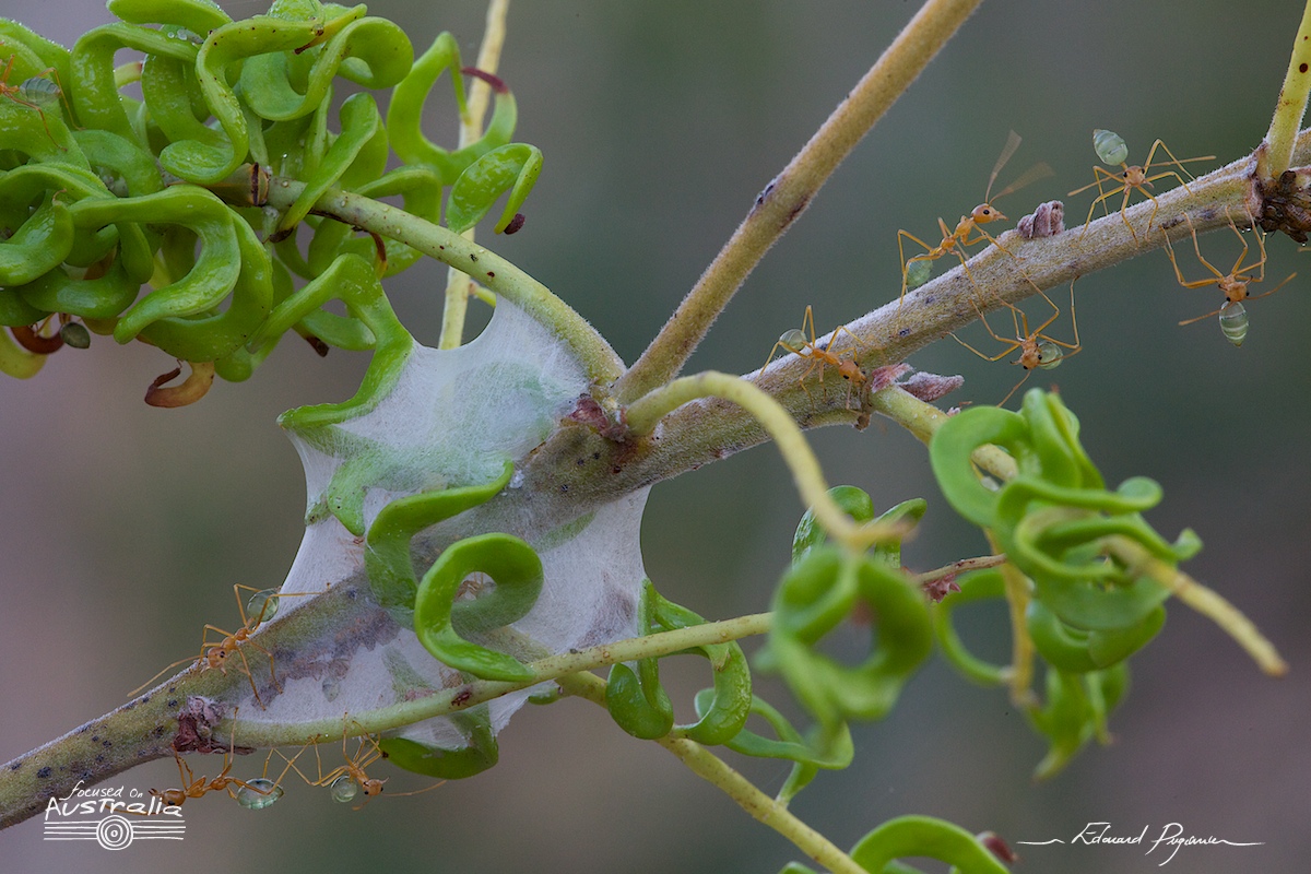 Weaver ants or Green ants (genus Oecophylla) are eusocial insects of the family Formicidae (order Hymenoptera). Weaver ants are obligately arboreal and are known for their unique nest building behaviour where workers construct nests by weaving together leaves using larval silk. […] Oecophylla smaragdina found in Australia often have bright green gasters.
