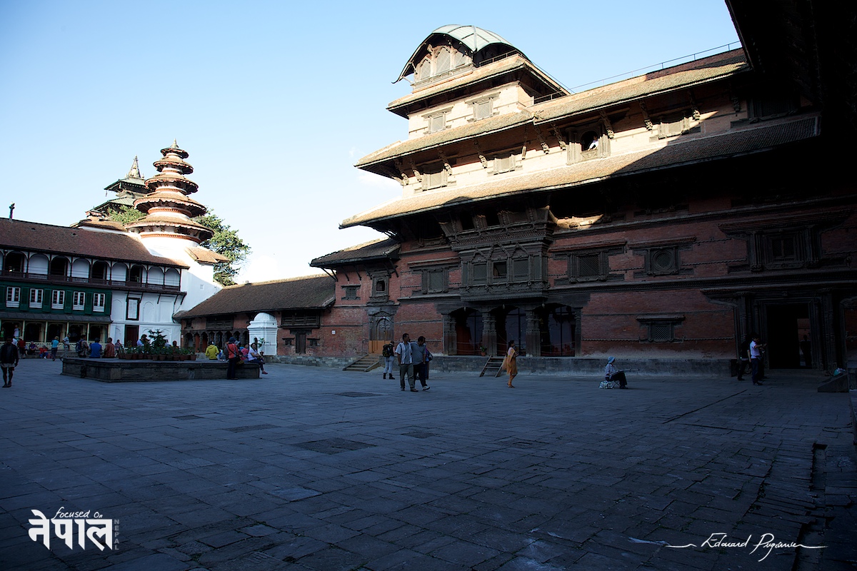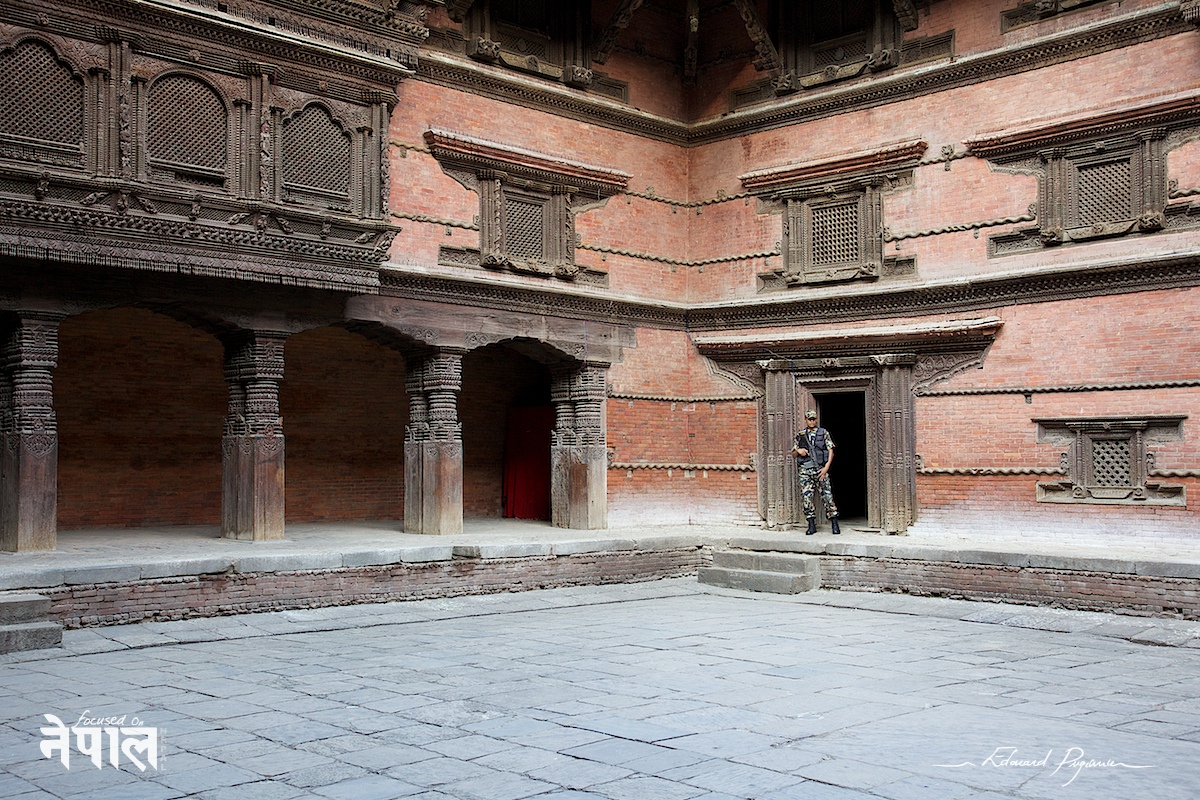 Ahead of the main entrance, adjoining the Hanuman Temple, is the Nasal Chowk courtyard (‘Nasal’ means: “dancing one”) named after the image of dancing Shiva located on the east side of the square. This is the square where Birendra was crowned as king in 1975, on the platform in the middle of the courtyard. At the south side of the courtyard, stands the nine storey Basantapur Tower. While the courtyard was built during Malla Period, the buildings around it, which depict intricately carved doorways, windows, and struts, were creations of the Rana rulers. Nasal Chowk is a rectangular in a north–south direction with entrance from the northwest corner.