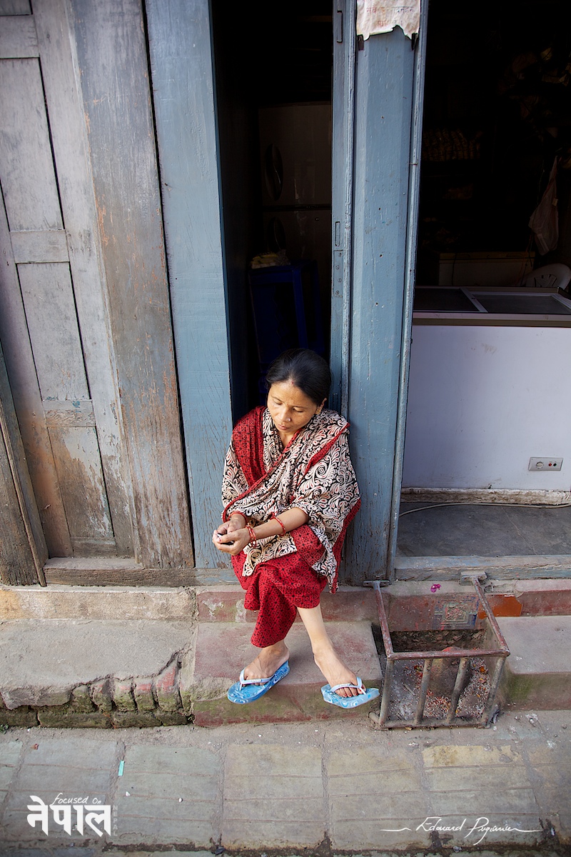 In Kathmandu's Durbar Square, this seller is texting while waiting for the next customer to come. To her left on the ground, a dedicated area to make divine offering, as it is on any single house.