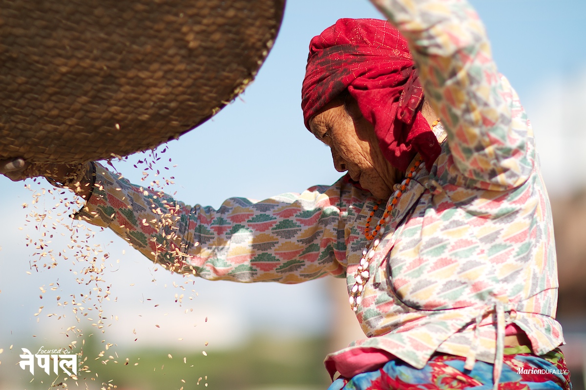 This picture is really beautiful. When we started our visit of Bungamati, Marion had my 5DMKII + 24-105 and me, the 7D + 85 1.2. We met some women being winnowing rice and Marion asked me directly the 85mm. I have not had my say and we exchanged cameras :) After obtaining their agreement with a nod, I took the second photo below, and Marion this beautiful image of the same scene, after a few seconds. For my part, I chose to make an overview (of course, she had my 85 ^^) and reduced the speed to capture the movement of the falling grains of rice. Marion kept my initial settings and selected the AF point. The most beautiful in this picture, beside it's composition quite effective, is that we get the chance that both the woman face and the fall of grains were perfectly aligned on the focus plan. At ƒ/1.2, even centimeters of shift would have produced a different result!
